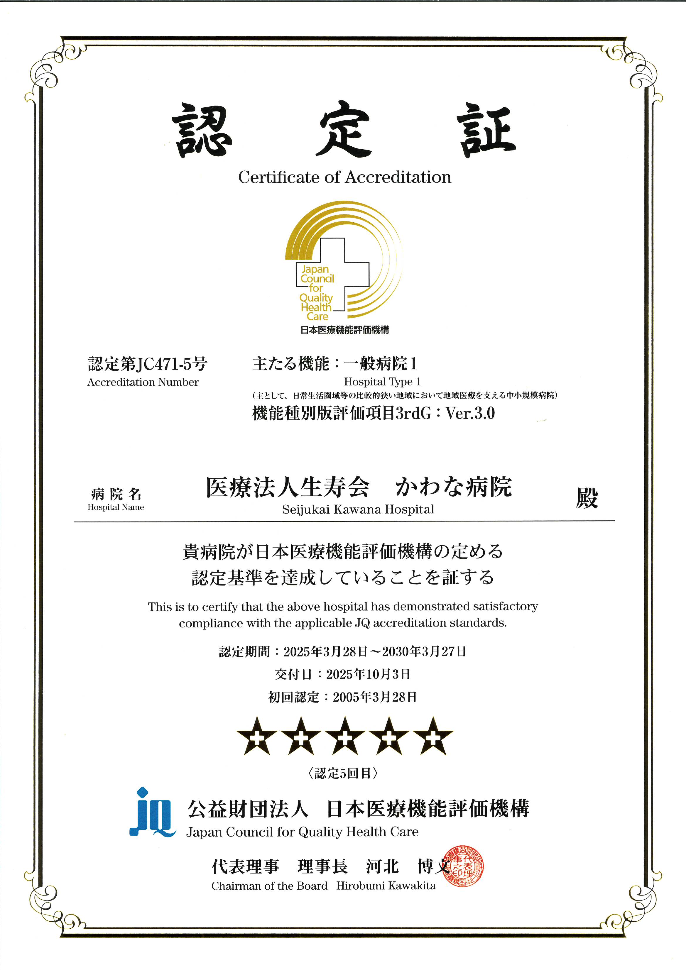 当院は、公益財団法人日本医療機能評価機構による「病院機能評価(一般病院1)」の認定を受けました。